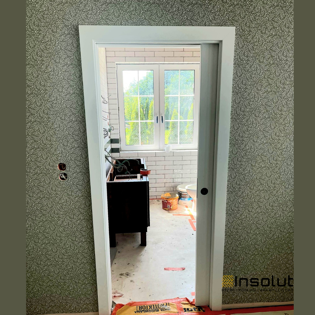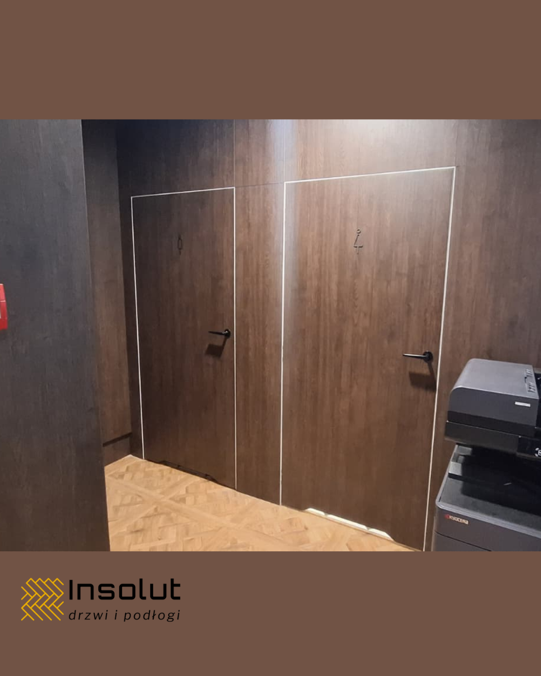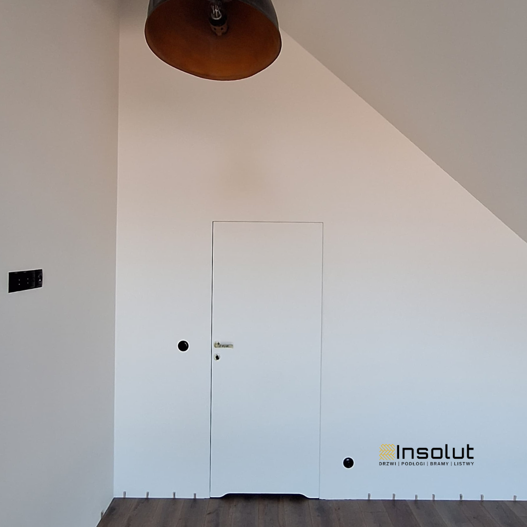 Drzwi ukryte mają wiele zastosowań: pokój, łazienka, garderoba a nawet garaż. Zaletą zastosowania takich drzwi jest możliwość dowolnego wykończenia powierzchni skrzydła. Daje nam to nieograniczone możliwości aranżacji. W tym wypadku pomysłem klienta była tapeta, która rewelacyjnie wpisała się w przestrzeń sypialni.