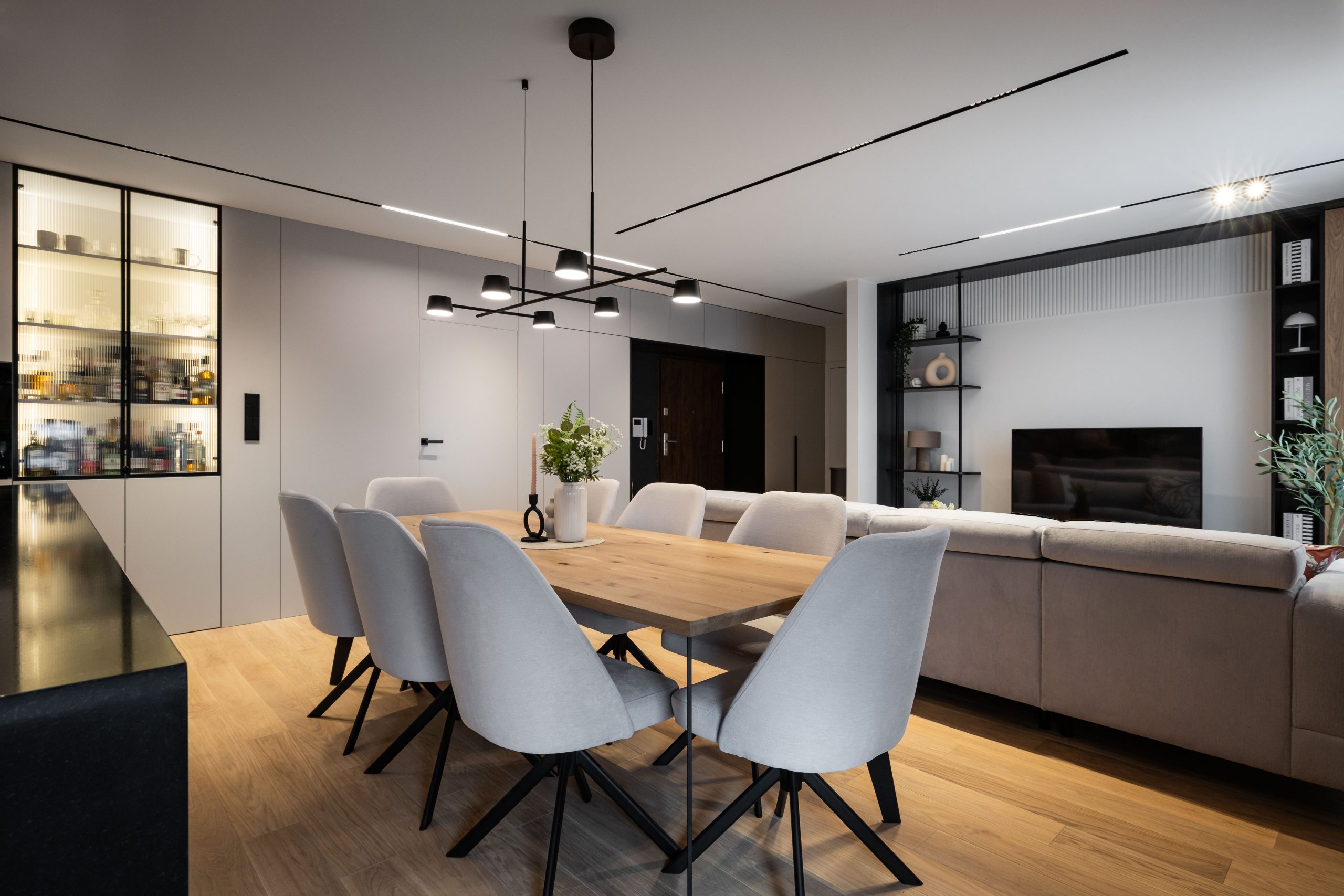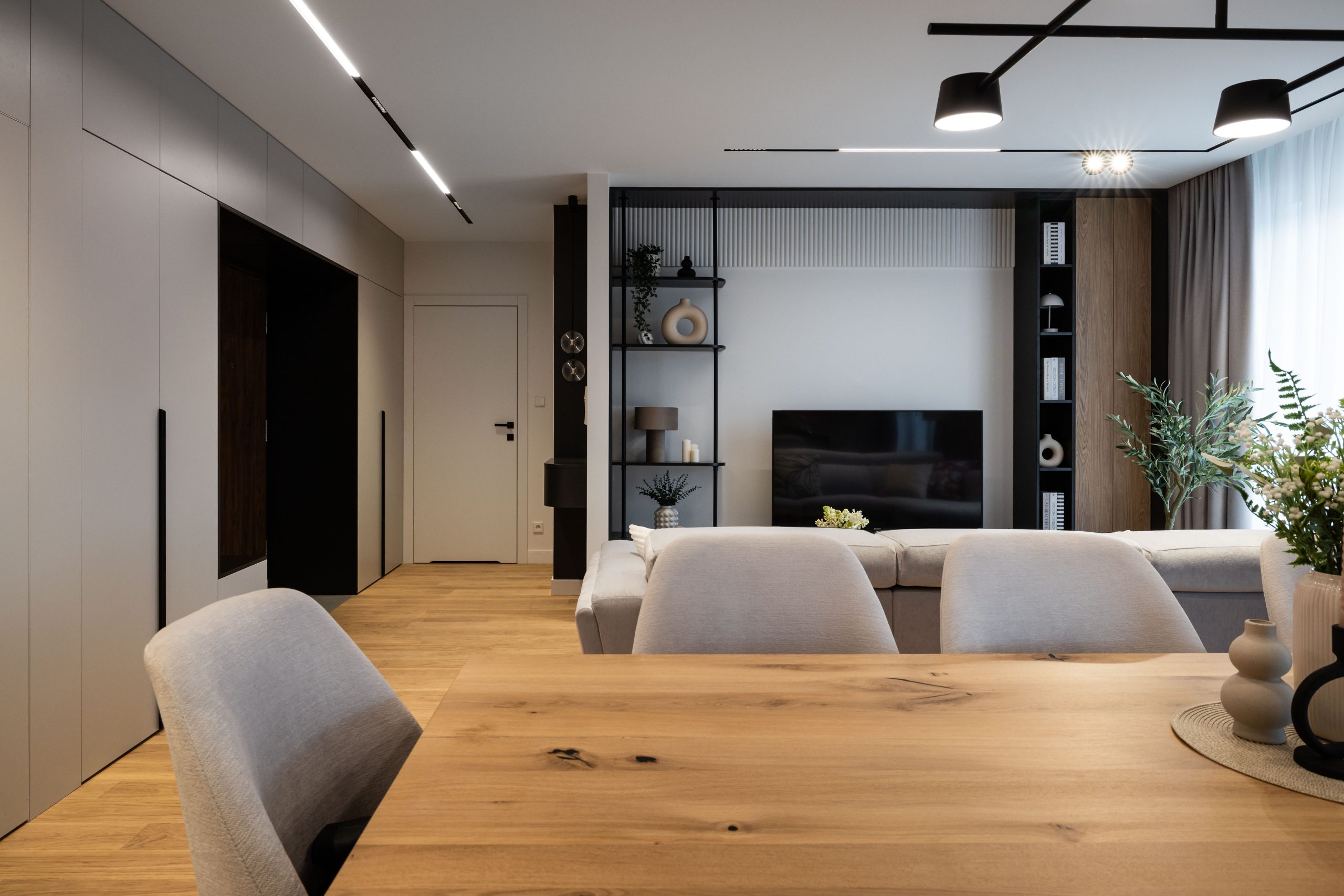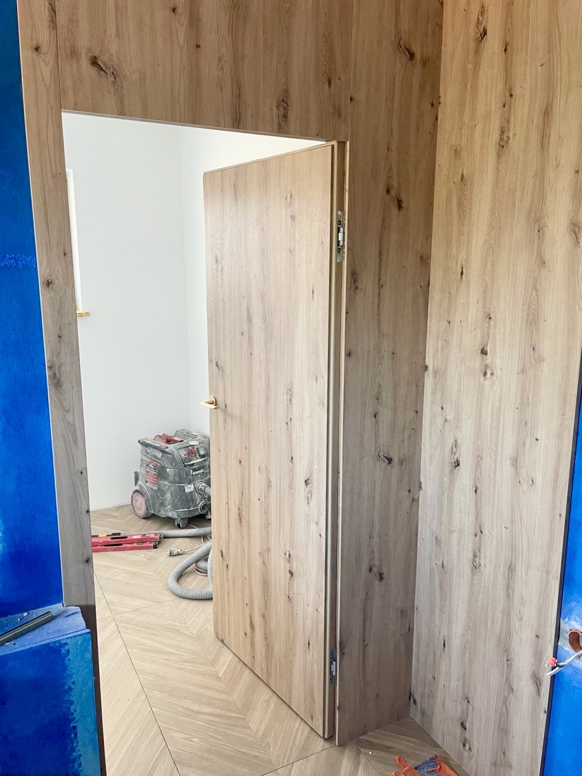 Zabudowa ściany jest obecnie coraz częstszym wyborem klientów. Dzięki takiemu rozwiązaniu uzyskujemy niewidoczne drzwi a zarazem piękną powierzchnię naturalnego dębu.